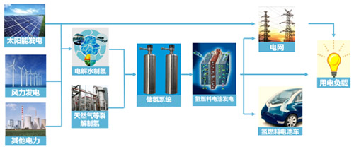 通過能源轉(zhuǎn)換,將富余的太陽能/風能轉(zhuǎn)換成氫能,氫能可以用固態(tài)儲氫的方式儲存起來,在沒有太陽和風的時候供給燃料電池發(fā)電,也可以用固態(tài)儲氫的方式將氫氣安全地運輸?shù)狡渌脷涞牡胤剑┤剂想姵匕l(fā)電或者其他用氫,實現(xiàn)可再生清潔能源的自給自足和互聯(lián)互通。